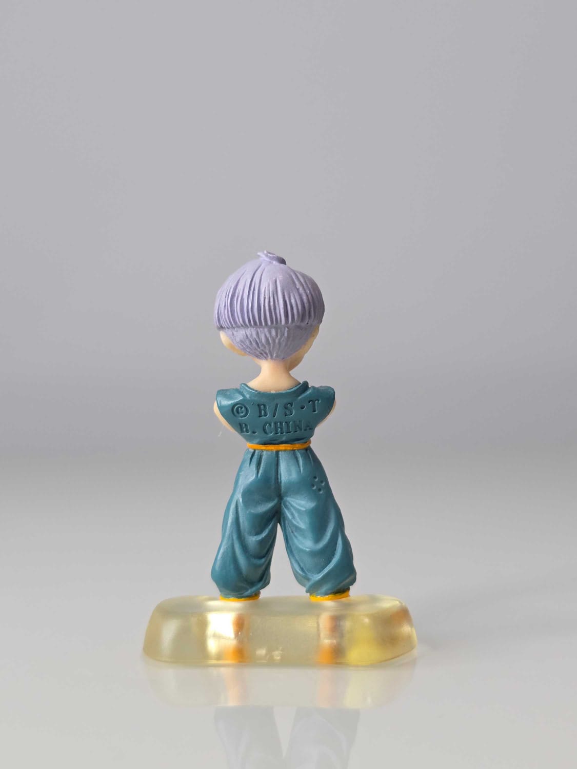 Figura gashapon de Trunks niño con su atuendo de entrenamiento y brazos cruzados, tal como aparece en la saga de Majin Buu.