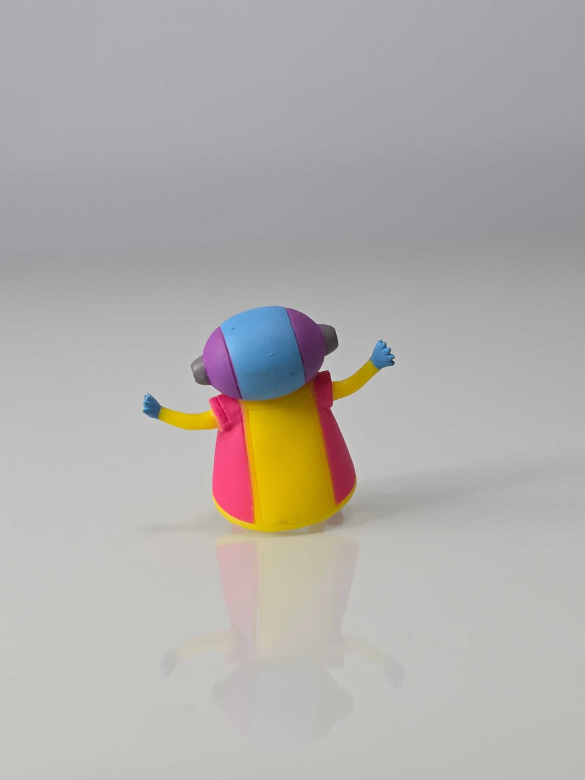 Figura gashapon de Zeno Sama en su clásica postura sonriente, con su traje ceremonial rosa, amarillo y azul.