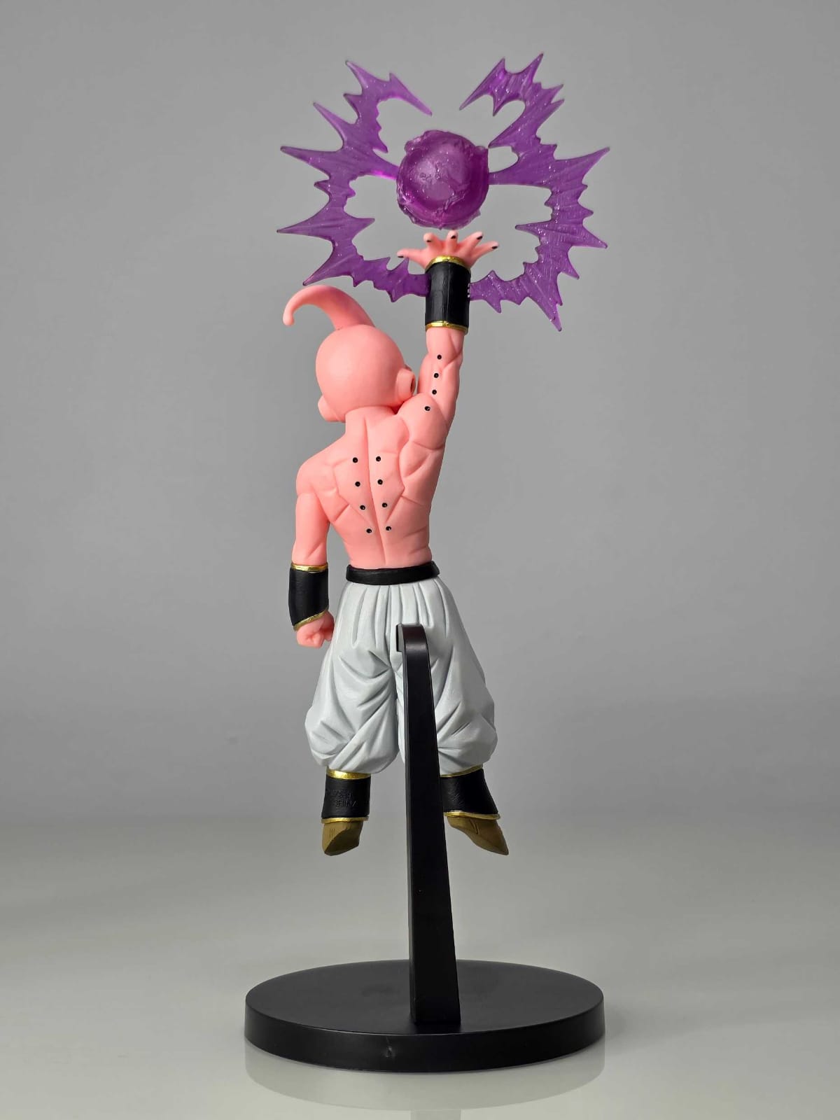 Figura de Kid Buu de la línea GX Materia, representando al villano en una de sus poses más emblemáticas mientras concentra una esfera de energía púrpura lista para lanzar su devastador ataque. La figura resalta por el efecto translúcido en el aura y la energía, junto con su acabado de color mate en la piel.