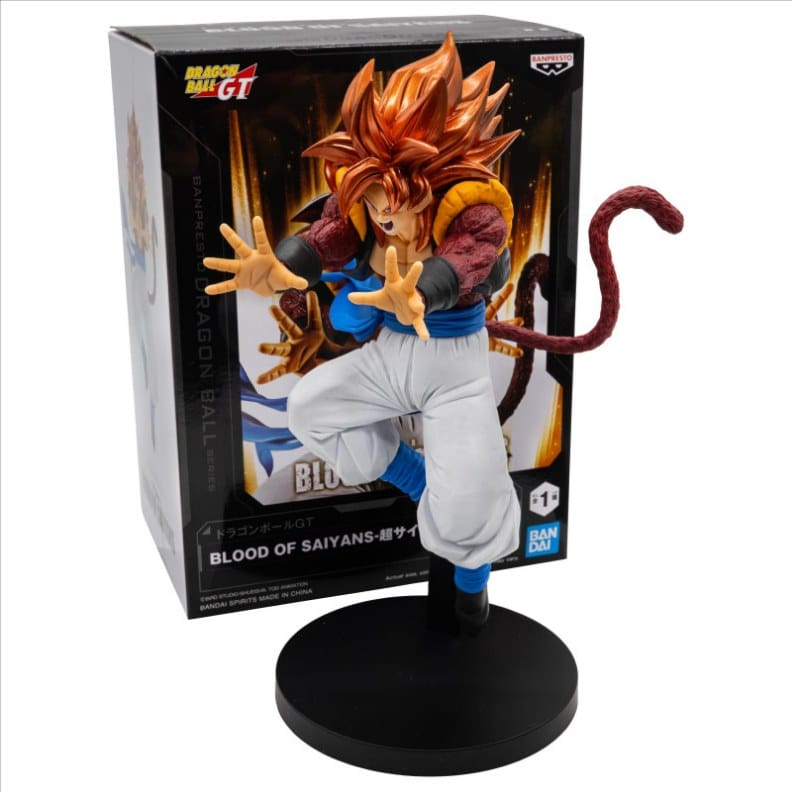 Figura original de Gogeta Super Saiyajin 4 de la línea Blood of Saiyans de Banpresto. Inspirada en Dragon Ball GT, muestra al personaje con una pose desafiante, cabello rojo y detalles sobresalientes en el pelaje y musculatura.