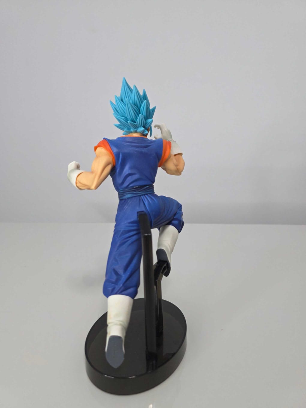Figura de Vegito Super Saiyan Blue en posición de dash o ataque rápido, con expresión confiada y diseño estilizado. Excelente detalle en el movimiento del cabello y ropa.