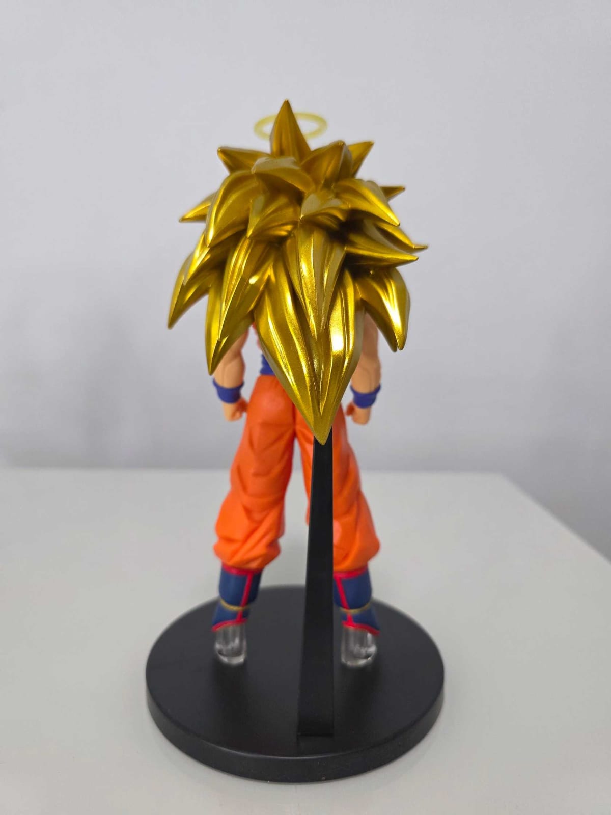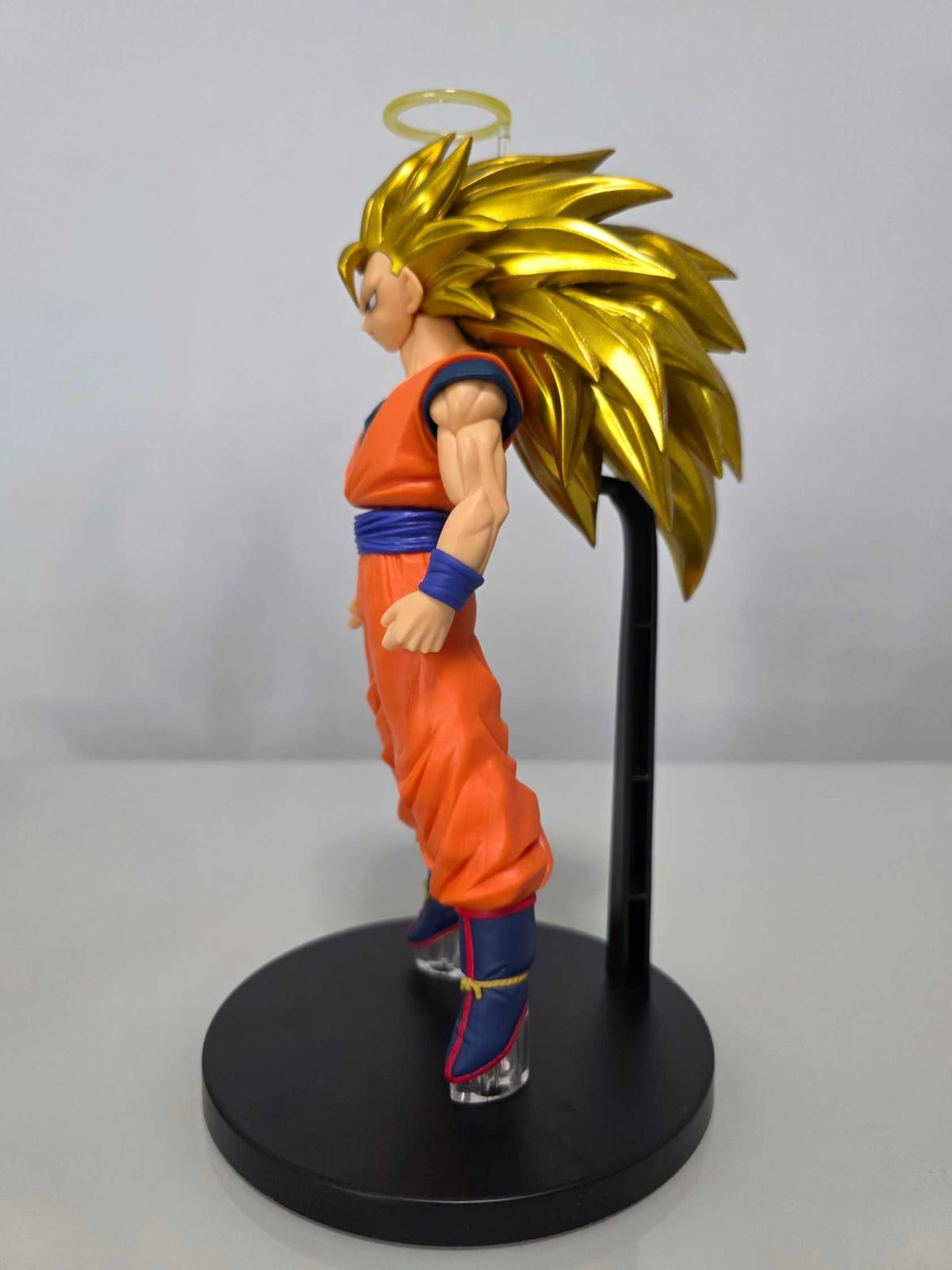 Figura de Gokú SSJ3 con aura poderosa y cabello dorado extendido. El acabado brillante y la postura firme destacan la esencia de la transformación en la línea Blood of Saiyans.