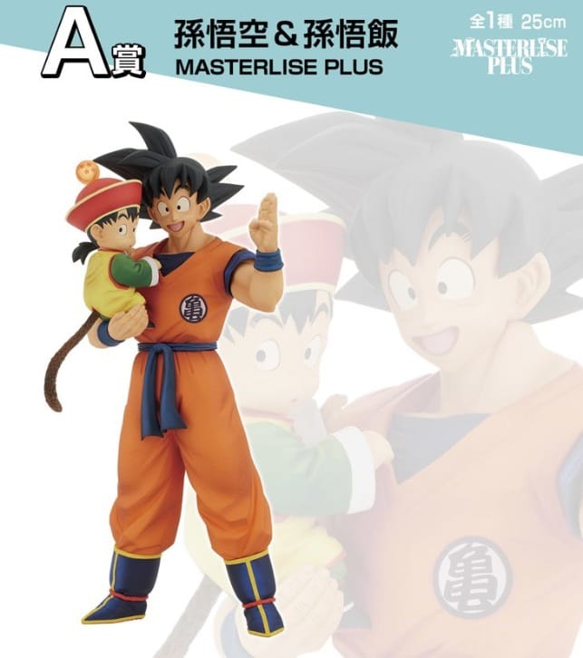 Figura de Goku con Gohan en brazos, perteneciente a la línea Ichiban Kuji Masterlise Plus, basada en la época de entrenamiento y los primeros años de Gohan. Pose cálida que refleja el vínculo padre e hijo.