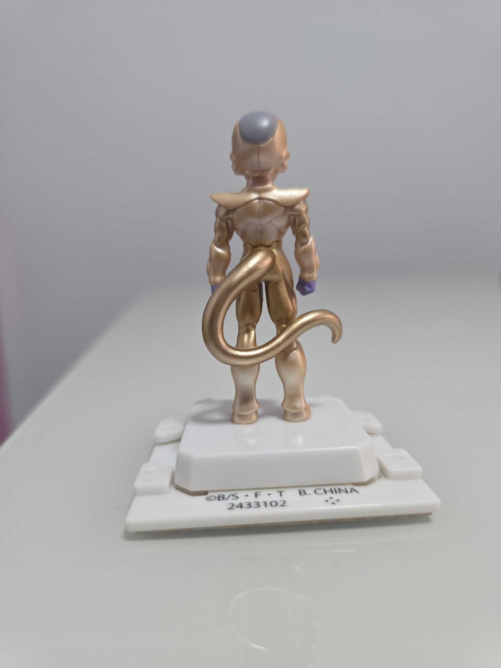 Figura gashapon de Golden Freezer, presentada sobre pedestal plástico de color blanco para exhibición.