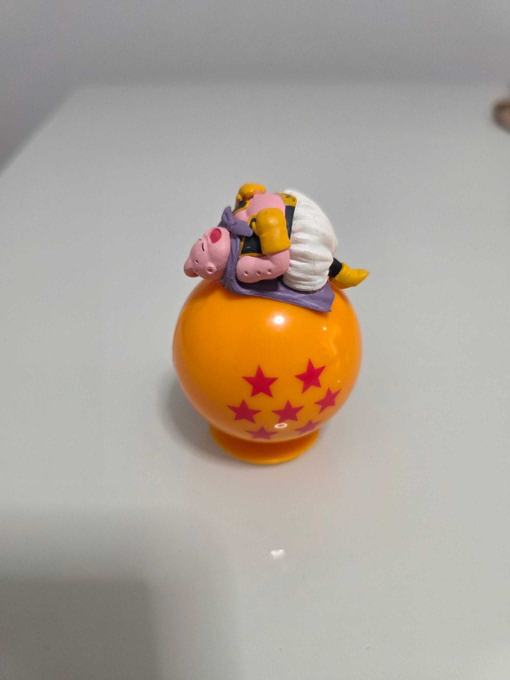 Figura tipo gashapon de Majin Buu Gordo, representado acostado relajadamente sobre una Esfera del Dragón.