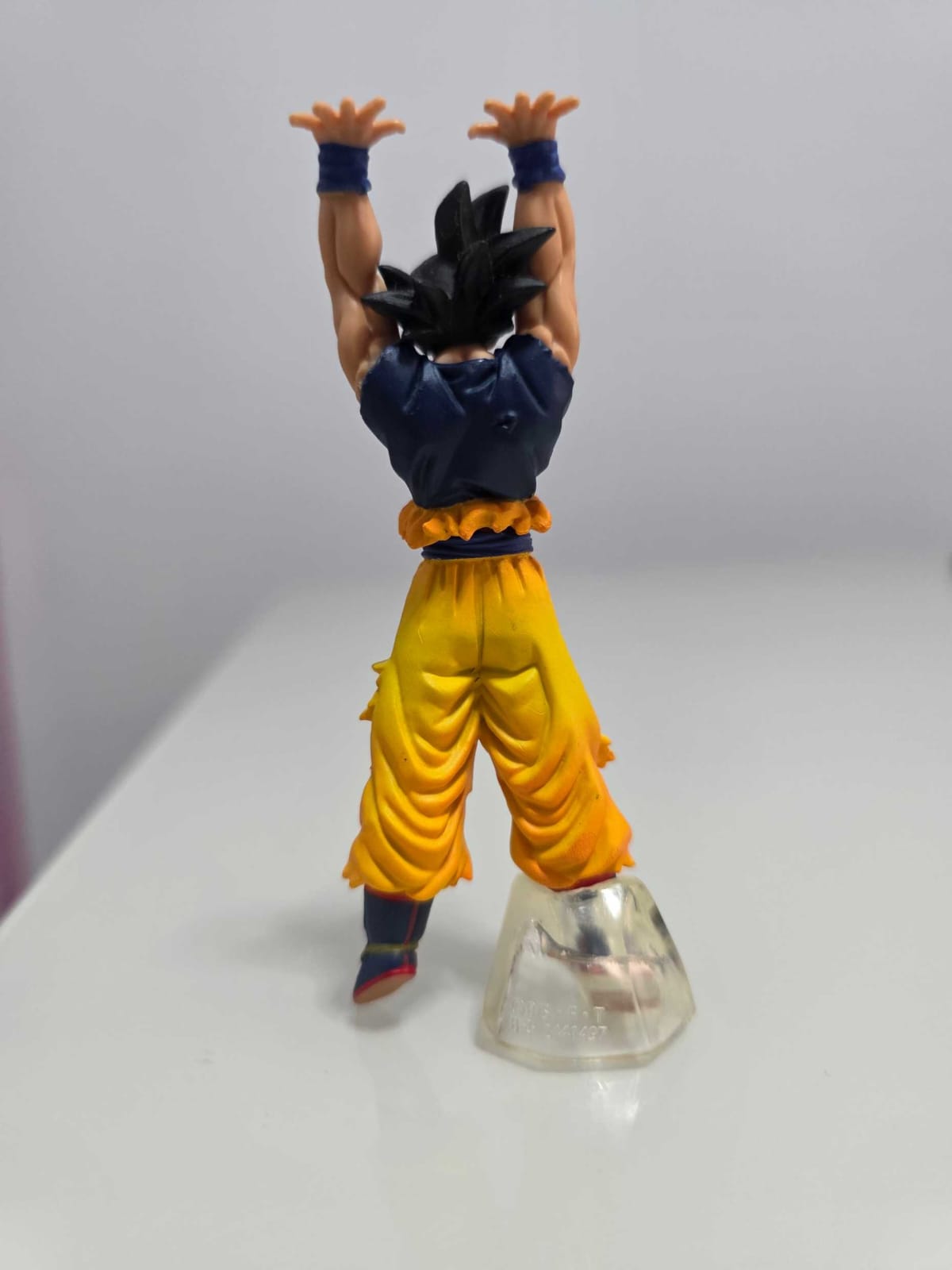 Figura gashapon de Goku realizando la Genkidama, con postura elevada y manos alzadas.