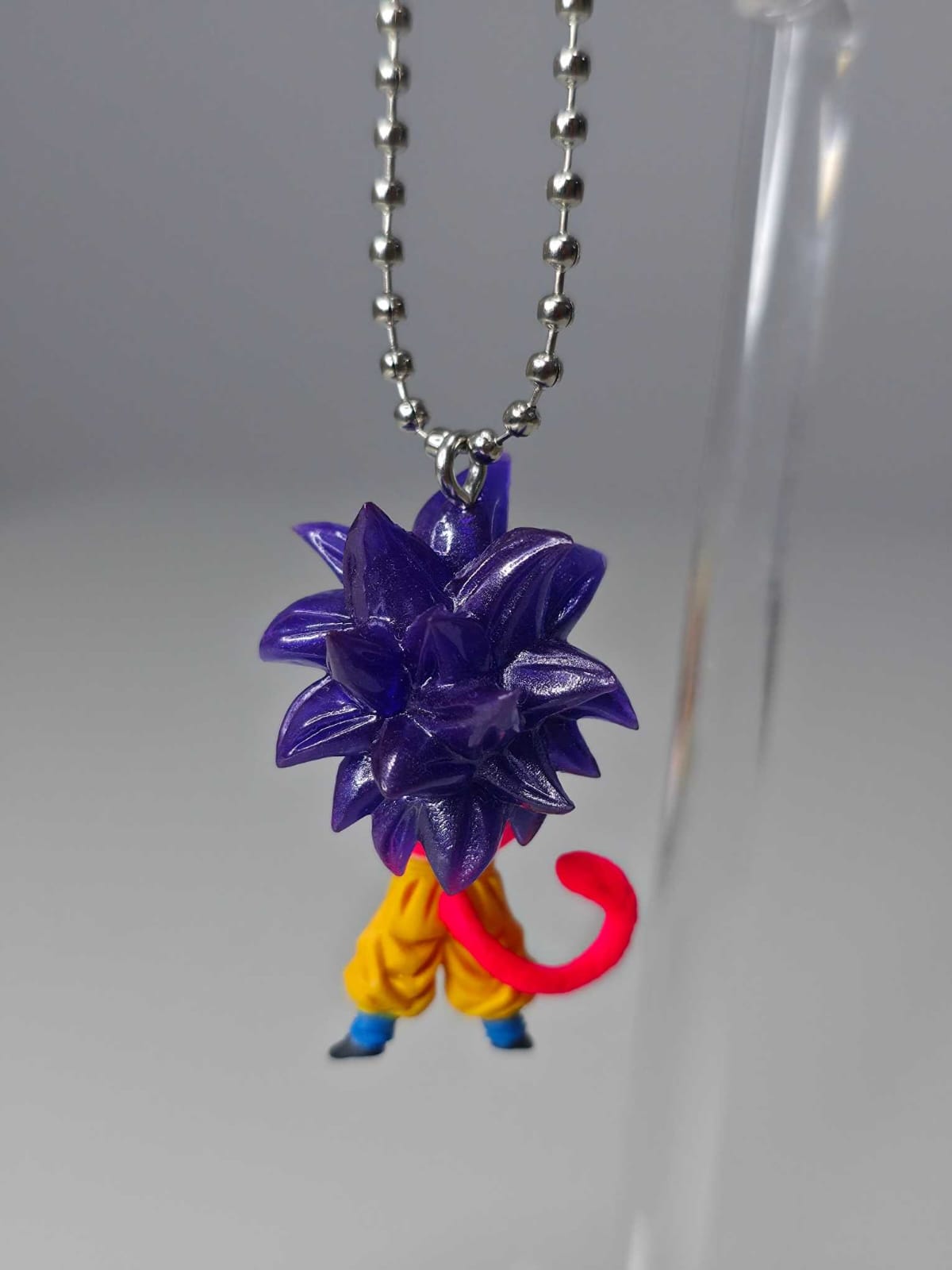 Llavero de Goku Super Saiyajin 4 con cabello morado, representado en pose dinámica.