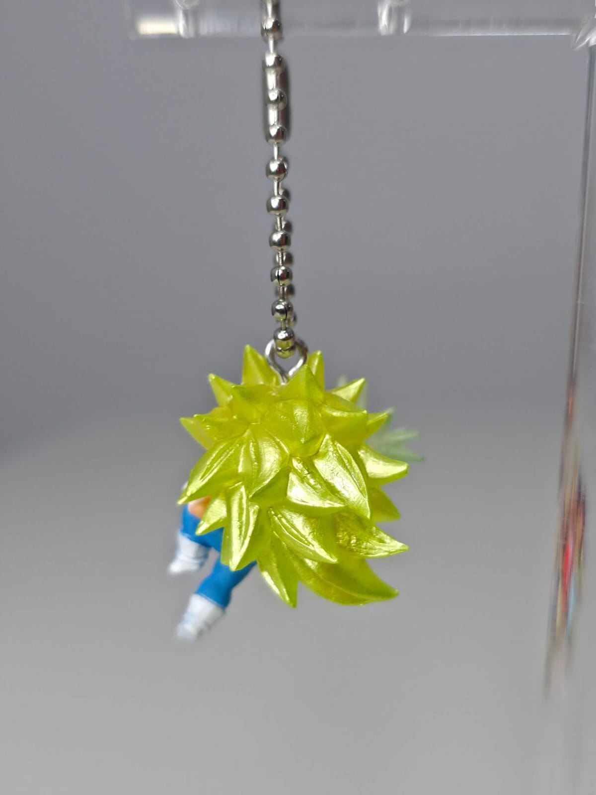 Llavero de Vegeta Super Saiyajin 3 con efecto de poder, representado en pose agresiva.